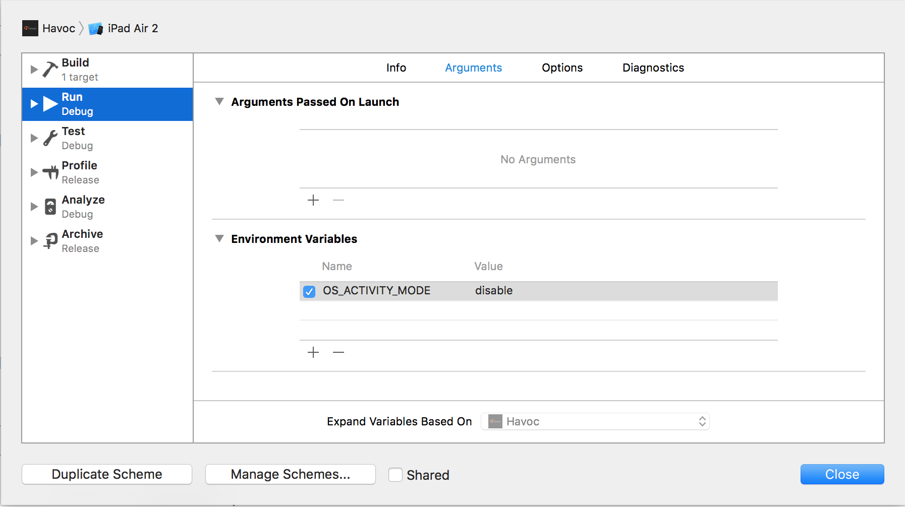 2. Add environment variable OS_ACTIVITY_MODE and set it to “disable”